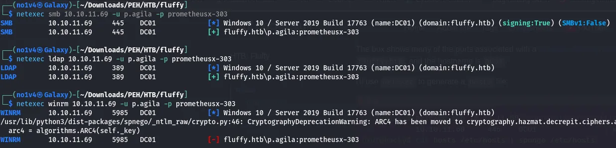 [+] IP: 10.10.11.69:445 Name: DC01.fluffy.htb Status: Authenticated