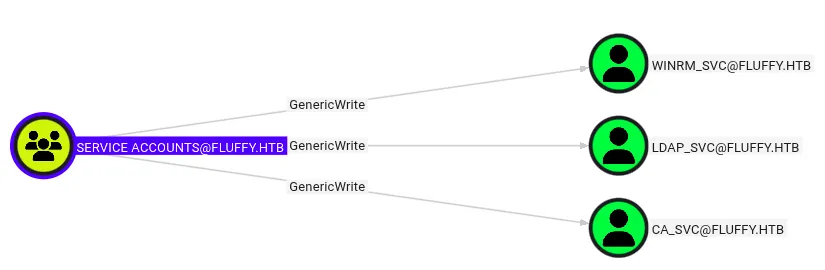 - Enumeration via BloodHound revealed misconfigured rights (GenericAll / GenericWrite) on service accounts.